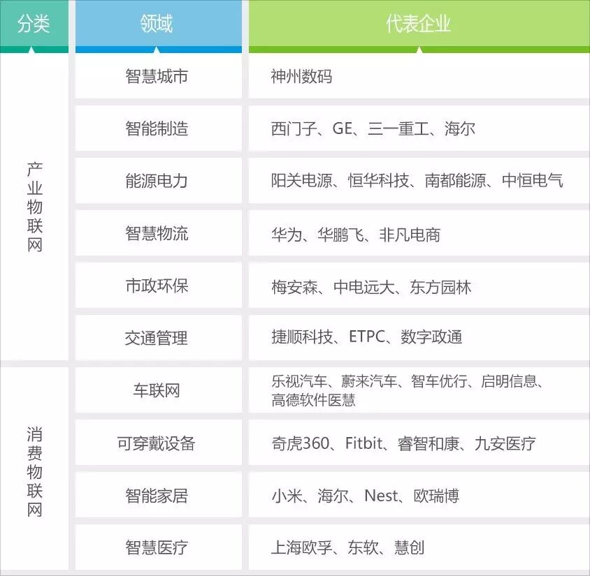 从业务分类看,物联网主要应用于车联网、智慧制造、智能家居、可穿戴设备等十大领域,如下表所示。这十个领域根据客户市场不同,又可为产业物联网和消费物联网两大类。