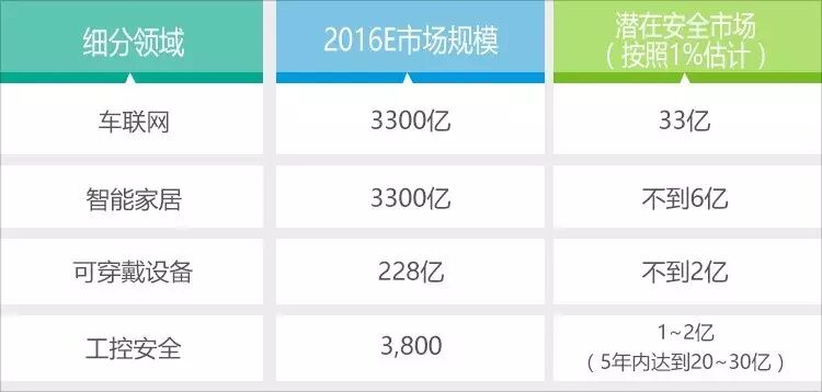 从细分领域看,目前规模最大的为车联网市场,2016年车联网市场规模预计达到3300亿元,潜在安全市场约在33亿。