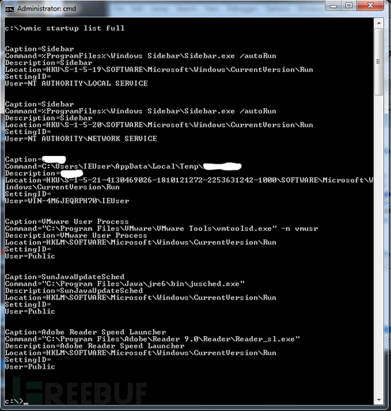 Windows已经有一个非常强大的工具——WMIC,在以下几种方式中较容易为你的调查建立启动项。只需打开一个命令提示符,然后输入【wmic startup list full】。这是一个真实的例子,猜一下哪个项目不属于其中,会是本地\临时文件夹吗?是的。如果你知道应该在列表中的东西以及一般正常运行的位置,你就 能在这里暂停,通常这都非常简单。找到程序,然后在malwr.com或者VirusTotal上查找它的散列,看看它有没有感染了其他什么,然后删除。