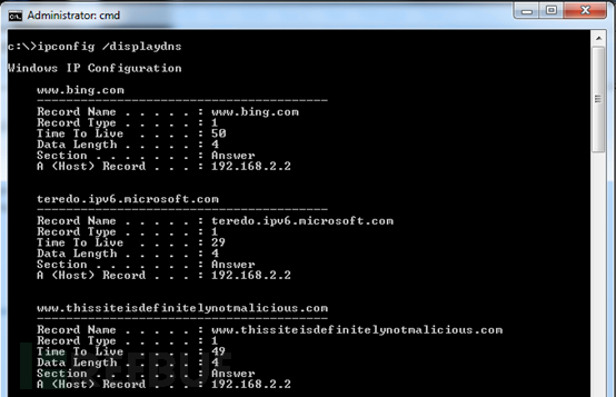 打开命令提示符,并输入【ipconfig/displaydns】。看看这些待反测的区域,有没有任何的异常现场?在VirusTotal或者其他地方寻找他们解析的域名及IP,看是否有与之相连的样本。如果有,那么你肯定被感染了。这里有一个现成的例子:
