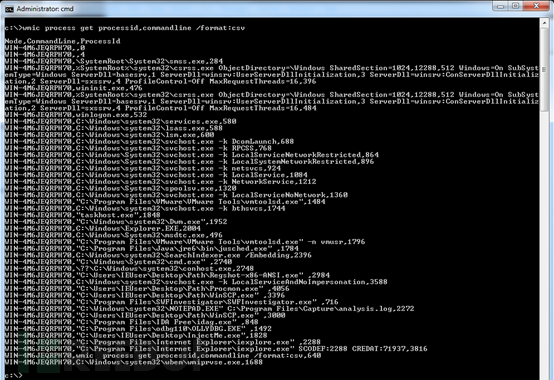 如果你不清楚自己在寻找什么,那这个用起来可能比较困难。但是检测方便并且容易通过路径或者 exe名称发现恶意软件。格式与其他的相似,或者你也可以得到更具体“get”版本。输入【wmic service list full| more】或者【wmic service get name,processid,startmode,state,status,pathname /format:csv】。这里有个小例子展示了只有服务名称和路径的情况。